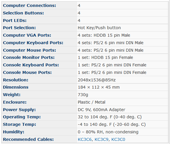 The AMCONN KVM414P allows you to control 4 PCs from one PS/2 console (1 keyboard, 1 monitor, 1 mouse). This series comes standard with keyboard and mouse emulation, superior video resolution, Hot Keys and manual access for switching computers. Logically accessible front panel keyboard and mouse ports make the series ideal for easy desktop use. A metal casing adds to the durability and reliability for applications and environments that require extended dependability.
