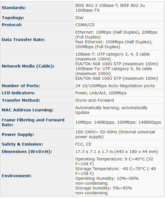 - 24 10/100Mbps Auto-Negotiation RJ45 ports supporting Auto-MDI/MDIX